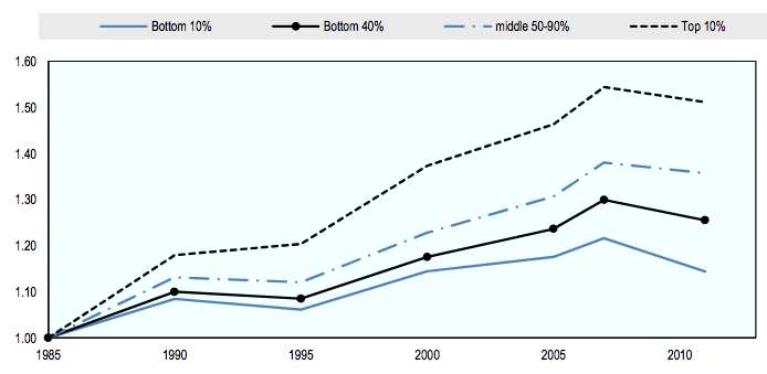 Trente années de grande compression des revenus pour les classes les plus pauvres et moyennes ont fini par laisser des traces. Au cours des dernières décennies, 40 % des populations des pays développés ont été tenues à l’écart de l’accroissement sans précédent des richesses produites dans le monde. « Parallèlement à la hausse des 1 %, le déclin de ces 40 % pose des questions sociales et politiques. Quand une partie si large de la population profite si peu de la croissance économique, le modèle social se casse et la confiance dans les institutions s’affaiblit », insiste le rapport. Les conséquences, selon l’OCDE, ne sont pas seulement sociales et politiques mais elles sont aussi économiques. Et c’est sans doute ce dernier point qui a ébranlé le plus les convictions de l’institution. Selon ses calculs, la montée des inégalités entre 1985 et 2005 dans les pays de l’OCDE a amputé la croissance de 4,7 % en cumulé entre 1990 et 2010.